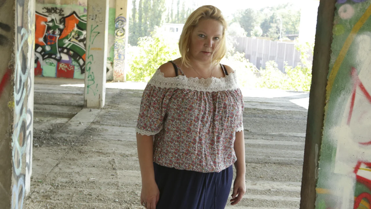 Busty blonde slobbers and gets railed against graffiti wall