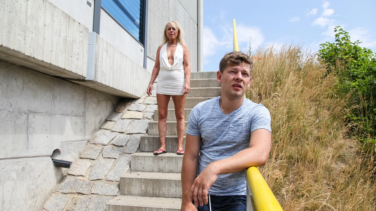 Koko Blond is a blonde woman with natural bobos, a great ass, long legs and a fit body for someone of her age. The MILF is having public sex on the stairs, rides in cowgirl and gives a blowjob.