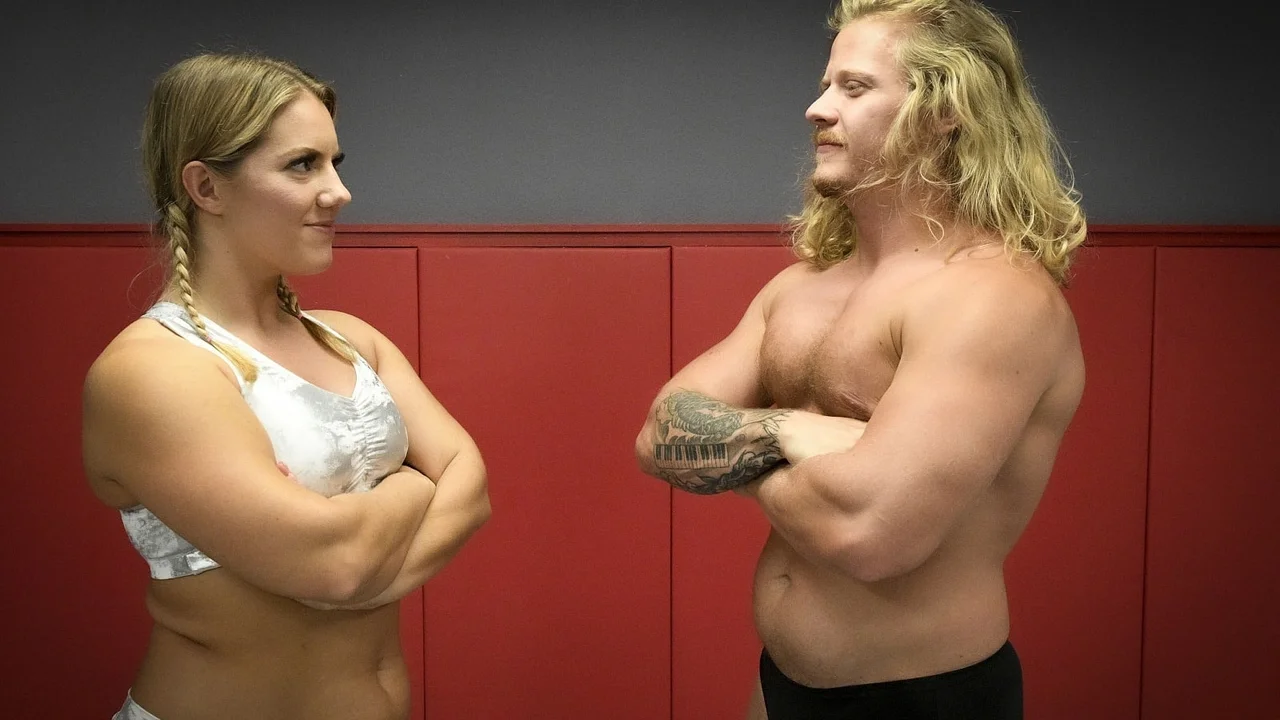 The screwing is happening after the wrestling and the grappling foreplay. The busty babe Candice Dare gives a blowjob to Leo Pumphouse, gets fingered and has sex while standing.