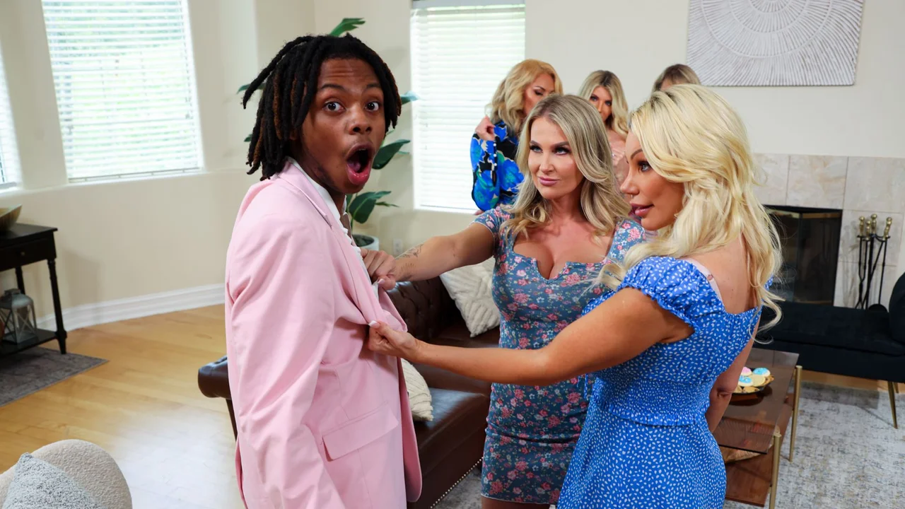 Brittany Andrews, Melony Melons, Andi Avalon, Taylor Vixxen, and Taylor Wild, invited the black stud Leo Malone over for a reverse gangbang in which the blonde girls get to feast on his BBC.