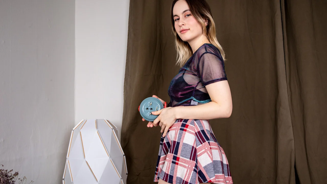 Sexy brunette Kira Queen strips to show off her pink pussy
