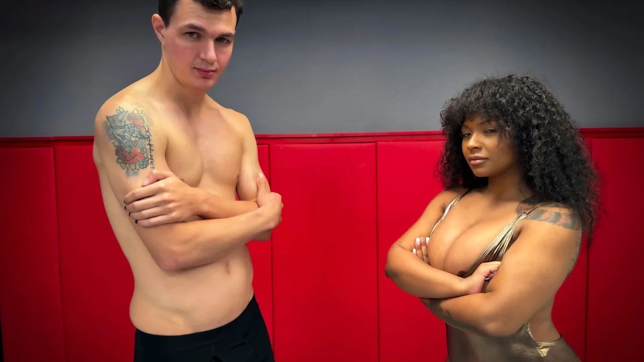 The wrestling match features a busty ebony and a hung man